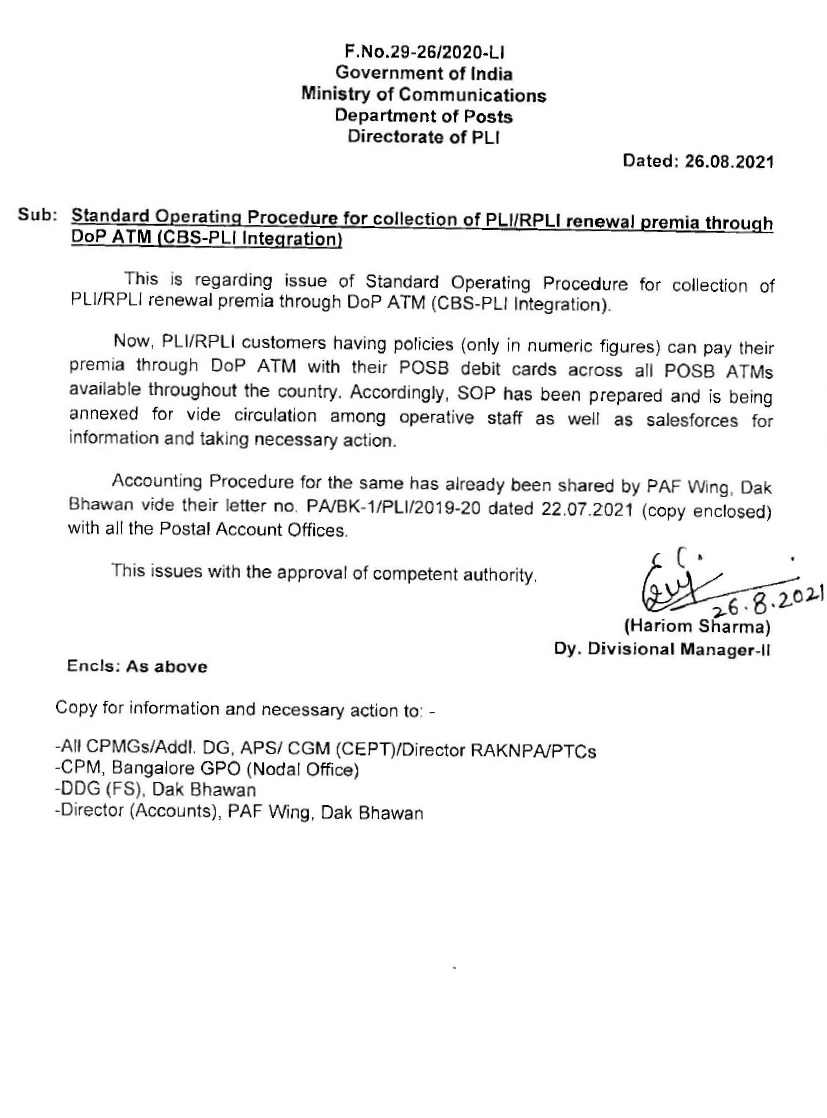 Standard Operating Procedure for collection of PLI / RPLI renewal premia through DoP APM (CBS - PLI) Integration